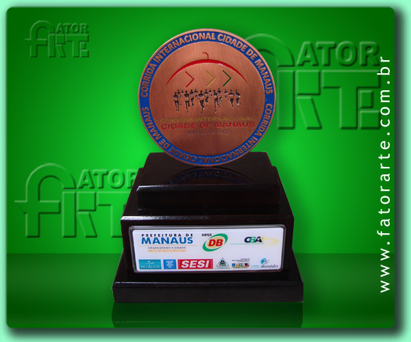 Troféu para o aniversário de Manaus com chapa de aço inox ou outro metal que se adéque como o latão escovado polido, personalização feita através do processo de fotocorrosão, a base de madeira é feita com madeira reciclada atendendo as exigências para preservação do meio ambiente.